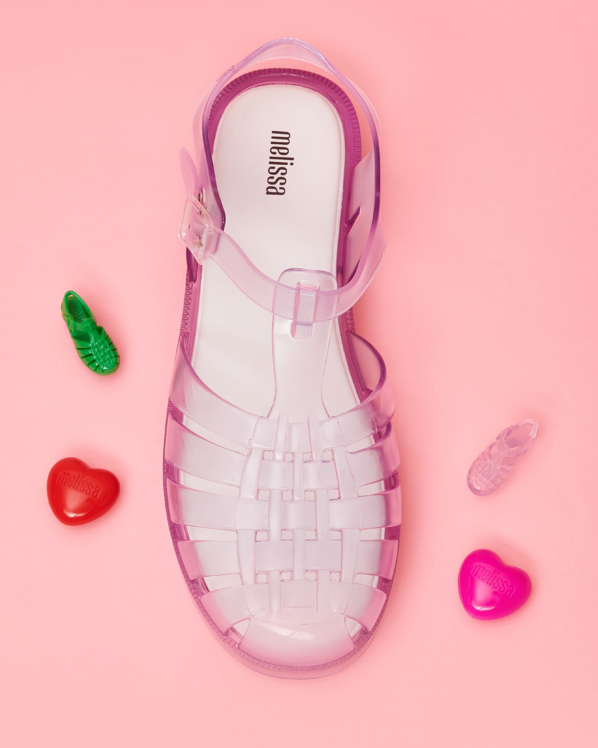 Todos nuestros zapatos cuentan con la fragancia exclusiva de Melissa, con notas de salida a chicle, notas de fondo a un dulce tutti-frutti veraniego y un irresistible toque de nostalgia. Deja que tus recuerdos Y2K te envuelvan cada vez que los uses.
